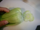 ちんげん菜の じくを 切ります。