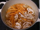 9の鍋に、切り干し大根、にんじん、ちくわを 入れます。