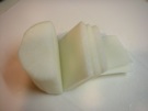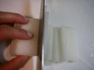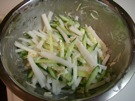 大根は 皮を むいて、たてに 5mmに 切ります。