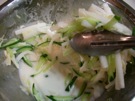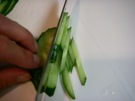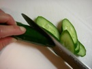 きゅうりは 3mmになるように、 斜めに 切ります。