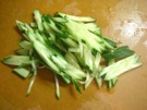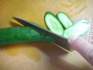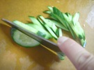 きゅうりを 2〜3mmになるように、 斜めに 薄く 切ります。