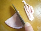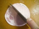 ハムを 半分に 切ります。