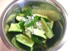 ボウルに きゅうりを 入れて、塩を ふります。