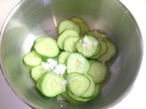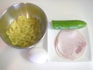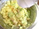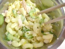マカロニ、卵、きゅうり、ハム、マヨネーズ、牛乳を 混ぜます。