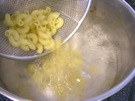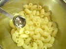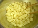 沸いたら、塩(小さじ1/2)と マカロニを 入れます。10秒くらい 混ぜて、そのまま 茹でます。