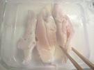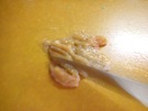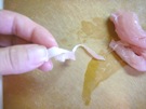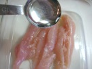 ささみの 筋を 包丁で 切ります。
