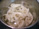 鍋に 水と れんこんを 入れて、中火に かけます。