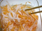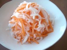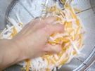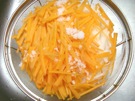 ざるに 大根と にんじんを 入れて、塩(大さじ1/2)を ふります。