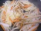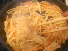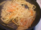 油が 熱くなったら、大根と にんじんを 入れます。2〜3分 炒めます。