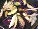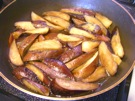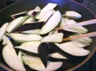 油が 熱くなったら、なすを 入れます。1〜2分 炒めます。
