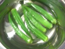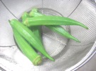 オクラを 手で 転がして、こすります。細かい 毛を 取ります。