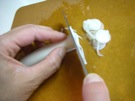 のりを 半分に 折って、はさみで 2〜3mmに 切ります。