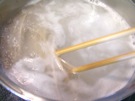 混ぜながら、めんと めんを はなします。「茹で時間」どおりに 茹でます。