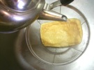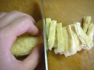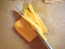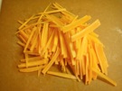 にんじんの 皮を むいて、たてに 2〜3mmに 切ります。