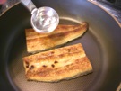 フライパンを 中火に かけます。 温まったら、うなぎを 入れます。Aを 上から かけます。