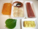材料の いくら、たこ、ほたて、まぐろ、大葉、卵焼きです。