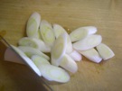 長ねぎを 5mmになるように、斜めに 薄く 切ります。