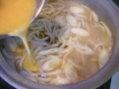 うどんが やわらかくなったら、卵を 少しずつ 入れます。丸を 書くように 入れます。