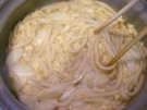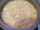 沸いたら、うどんと 長ねぎを 入れます。2〜3分、煮ます。