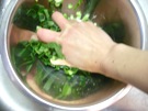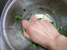 小松菜が やわらかくなったら、手で 水を しぼります。水を 捨てます。