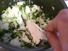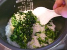 ご飯が 炊けたら、小松菜、ごま、しらす干しを 入れます。混ぜます。