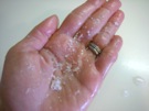 手を こすりあわせて、両方の 手に 塩を つけます。