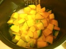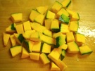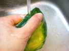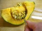 包丁で 皮を 切ります。皮を 少し 残して 切ると、色が きれいです。