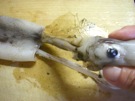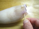 するめいかの 胴の 中に 指を 入れて、くっついている ところを はなします。