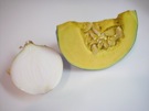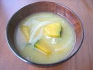 鍋に かぼちゃ、玉ねぎ、水、だしを 入れます。