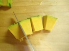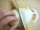 玉ねぎの 皮を むいて、たてに 3mmに 切ります。