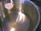 鍋に 水と 顆粒だしを 入れて、中火に かけます。