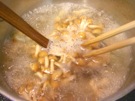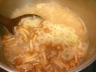おたまに みそを 入れます。箸で 混ぜて、溶かします。