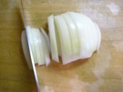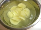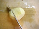じゃがいもの 皮を むきます。半分に 切って、5mmに 切ります。