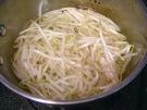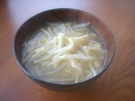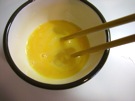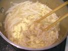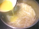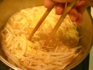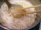 弱火に して、みそを 入れます。(おたまに みそを 入れて、箸で 混ぜます)
