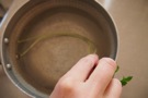 みつばの 根を 切ります。茎を 10~20秒 お湯に 入れます。