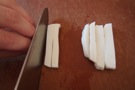 かまぼこを 半分に 切って、2枚にします。細く 切ります。