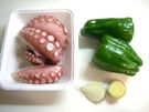 材料の ゆでだこ、ピーマン、にんにく、生姜です。