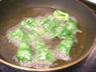 フライパンに 油を 入れて、170〜180℃に 熱します。ピーマンを 入れて、20〜30秒 揚げます。