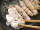 フライパンに 10を 入れます。肉を 巻いた 終わりを 下にします。
