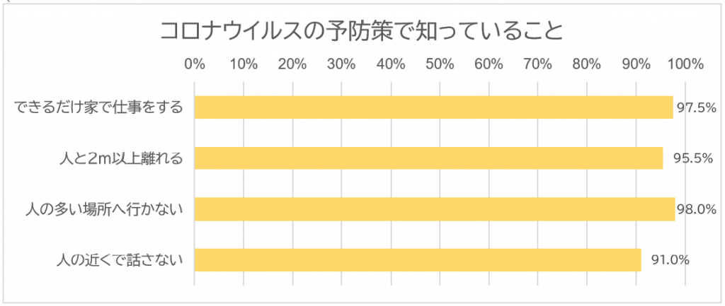 感染拡大予防策の中で、代表的なもの4つについて知っているかどうか尋ねたところ、全項目について9割以上から「知っている」との回答がありました。回答者の中には、主に外国語で情報収集を行う人も一定数ありましたが(詳細は5月11日以降配信の続報リリース参照)、主な予防策は諸外国でも共通しているため、認知度が高かったと考えられます。