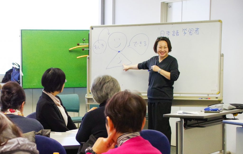 昼のクラスは女性の参加者が多く、実際に活動してみたいという熱意が感じられました。参加者のみなさんは休むくことなく修了証を手にしました。有田講師(日本語教育コーディネーター)の元気でわかりやすい説明は人気で、もっと学びたいとの感想が多くありました。