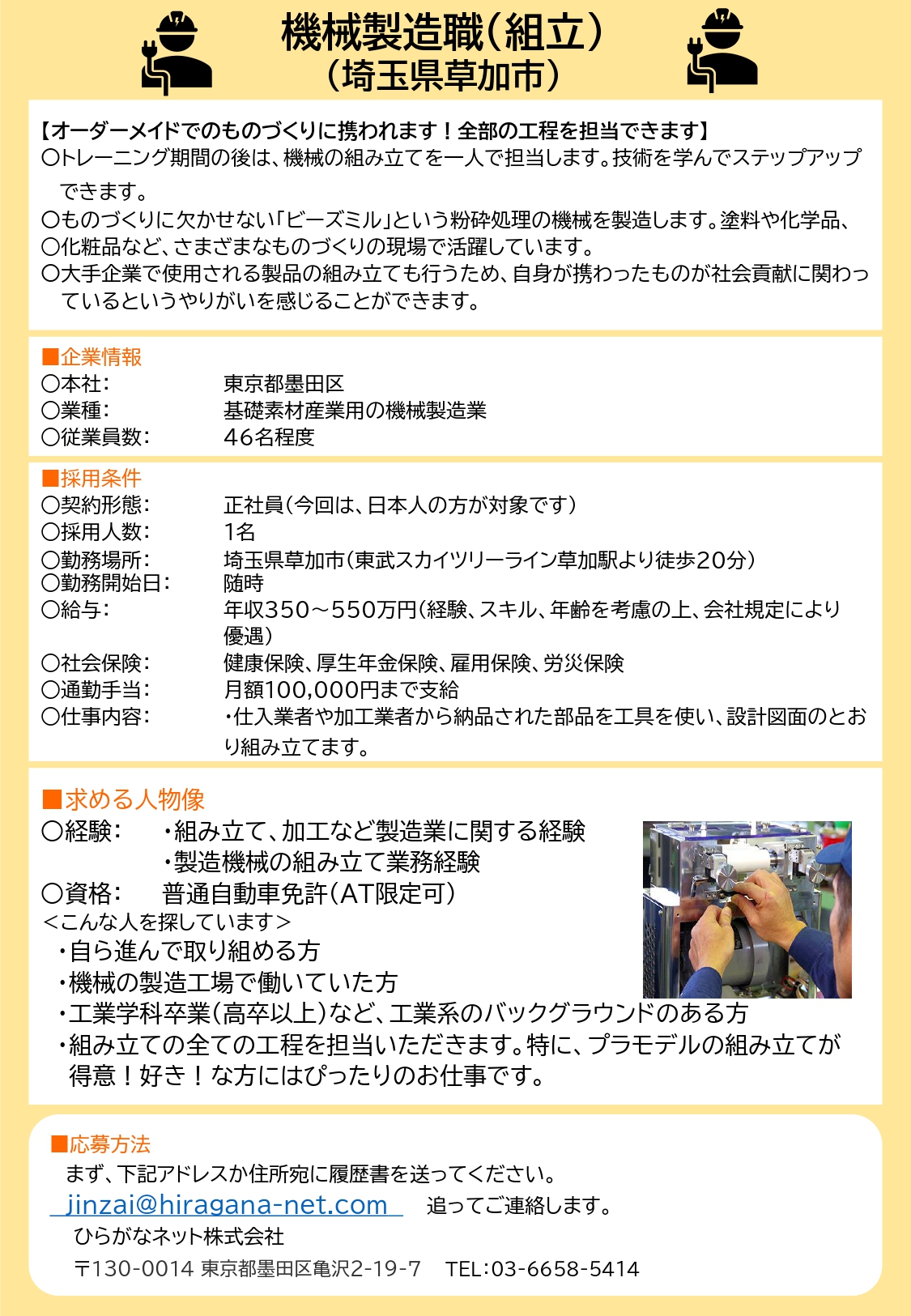 ひらがなネット > 【職業紹介事業】新しい求人情報を掲載しました(製造職 組立)(製造職 サービス)